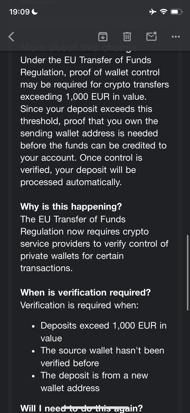 i have another issue / question regarding transfering sol to an another person’s wallet in europe. today i transferred a good amount of sol to my friends kraken wallet but the transaction / deposit was put on hold. seems there are new regulations in europe. he has to verify this (my) wallet. does that also mean NFT’s don’t work for me anymore after he has done that?